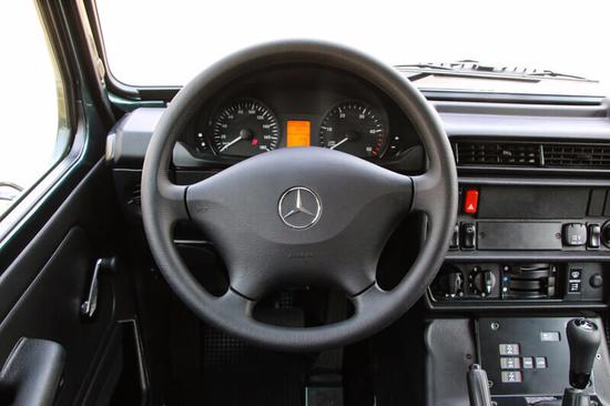 在内饰方面,G300依然将实用的理念延续到底,整个内饰设计朴实,各个功能区域清晰明了,很好的传承了G系列的经典设计。改装奔驰G300一改民用豪华、高贵的设计,而是采用将实用性进行到底的设计理念。在仪表台区域,G300采用传统机械式指针设计,可以显示速度、转速、水温与剩余油量。值得注意的是,作为一款柴油车,G300转速表最大值达到了7000rpm。方向盘采用真皮设计,没有多余的按键。可喜的是,奔驰G300配备了方向盘安全气囊,为驾驶员提供安全。