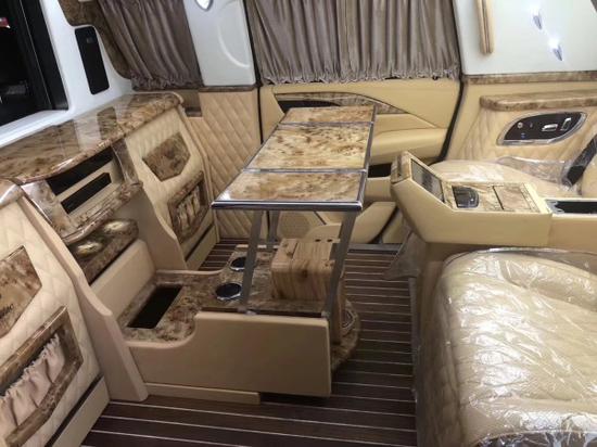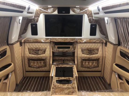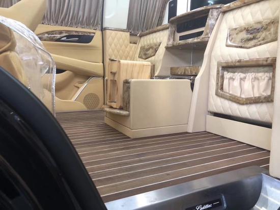 18款凯迪拉克总统一号隐藏六座商务车内饰部分:舱内隔断:可升降分隔屏,32寸超薄液晶电视 音响设备:BOSS环绕音响,DVD 舱内灯饰:氛围灯 LED灯饰,迈巴赫棚顶灯 舱内吧台:酒柜 咖啡机舱内桌板:电动隐藏式伸缩桌板 地板材质:柚木地板 舱内天窗:全景开启式大天窗。