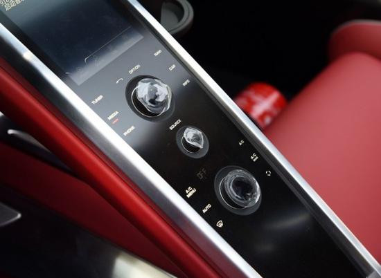 作为一辆天价跑车,918内饰提供多种选配。今天这台则是石榴红+银色饰边的内饰方案之一,偏向华贵和精致,中控台采用的是镂空设计,中控面板底下存在一块巨大的空间。保时捷在这个位置上选择了用空间换格调——这个区域没有任何储物空间,取而代之的是两款限量版的铭牌。