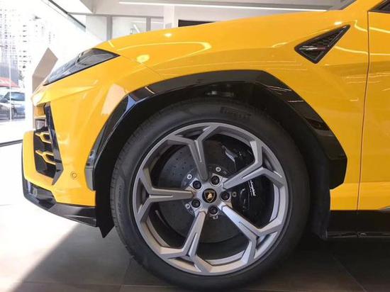 车身侧面,仍然是超级跑车的感觉,只不过是车身高度更高了,Urus装配了22英寸的车轮,轮毂辐条非常稀疏,直接可以看到里面碳陶瓷复合的刹车盘,以及硕大的刹车卡钳。