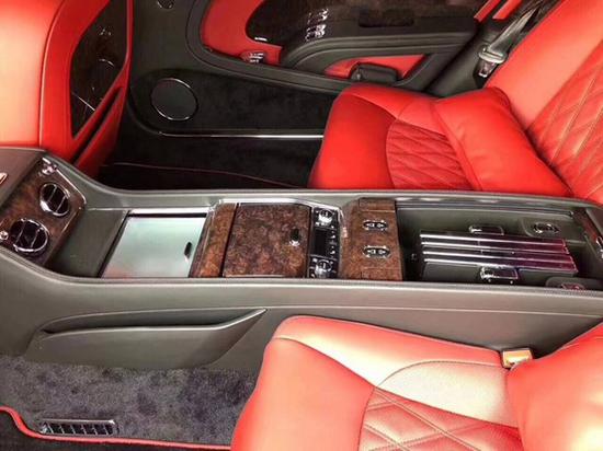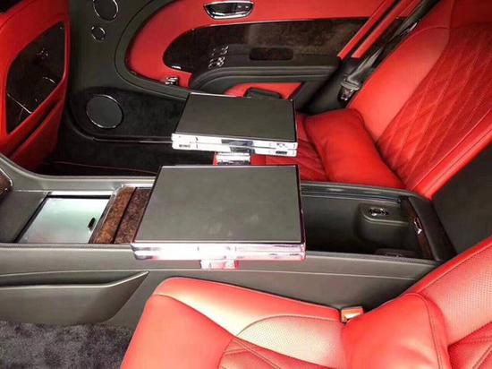 2018款宾利慕尚长轴距版玫瑰金配铁磁灰外观/红色配黑色 配置穆勒包(21轮,车门带穆勒字样门槛嵌饰板,铸币式表面车门把手,前后排羊毛地毯,宾利徽章头枕刺绣, 后侧化妆镜饰面环绕),优选包(金色飞翼小人,宝石机油燃油盖,遥控车库门开启装置,两把雨伞,泊车钥匙),舒适包长轴距版(航空躺椅,座椅通风按摩,舒适型头枕,阿尔卡塔纳鹿皮头枕靠垫),暗色伯尔核桃木实木饰条,全尺寸中控台配两个可活动小桌板,后排小桌板,内饰情绪灯,6碟播放器,宾利影院--双10.4寸自动折叠平板电脑带地图等