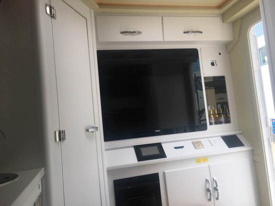 车门侧是车内的厨房区。厨房区的下部分是冰箱和拉篮。拉篮能够充分的固定各种瓶瓶罐罐,不会在崎岖不平的道路上东倒西歪。灶台上布置了电磁炉和带盖洗菜池。电磁炉上方是车内抽油烟机,房车专用微波炉布置在橱柜的最上方。