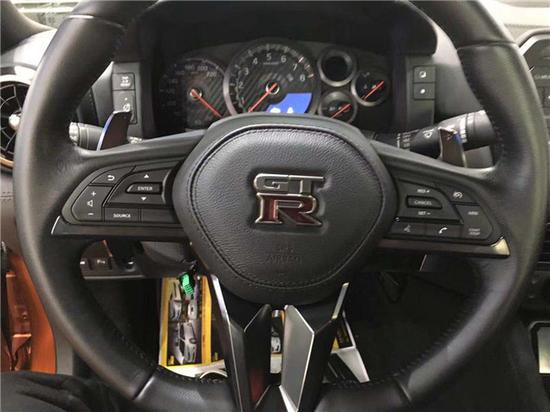 日产GTR的内饰运动色彩要比普通版更浓郁一些,全黑内饰被一些红色的装饰点缀的恰到好处。方向盘采用反毛皮,出汗打滑的情况基本就杜绝了,抓握感非常不错。仪表盘的转速表更换为红底衬托,机械感非常强烈,真心好看!