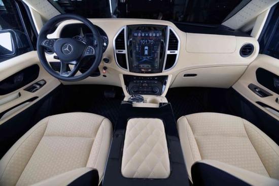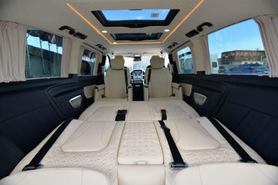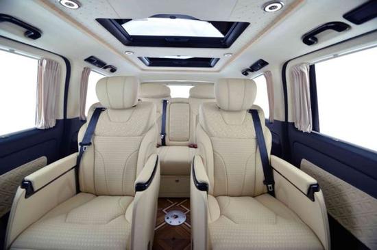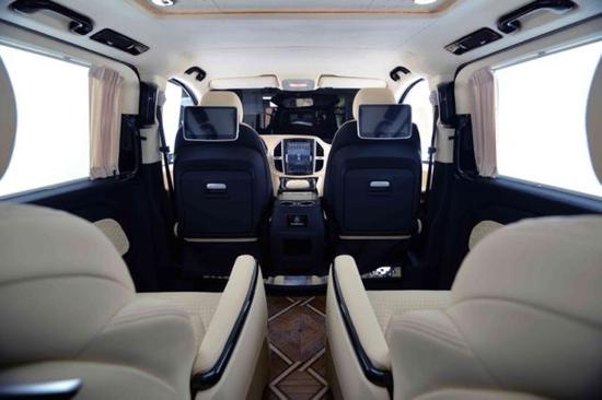 配置:七座(2+2+3),17寸合金轮毂,行李架,V一CLASS中网,中文导航,中央竖屏式大屏导航,LED鹰眼氙气大灯,流水型转向灯,格型包覆中央扶手带冰箱,仪表台包覆,内门板包覆,,主副驾驶电动座椅,第二排通风加热可旋转航空座椅,第三排电动可放平座椅,第三排杯架,第三排座椅后抽屉,双侧电动门,豪华整车窗帘,后掀式电尾门,可拆卸式钢琴漆会议桌,豪华柚木地板,双高清定制头枕DVD,主副驾驶后背小桌板,镀铬门槛,顶部十二宫格及鹿皮绒包覆,贵宾区强化隔音隔热处理,触控屏调光控制系统