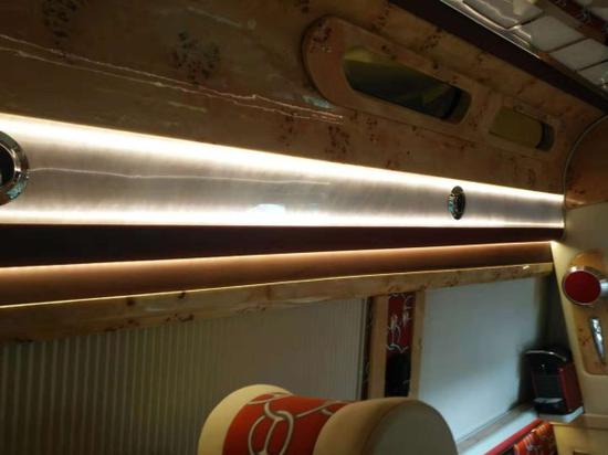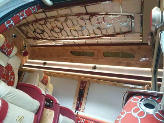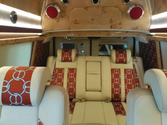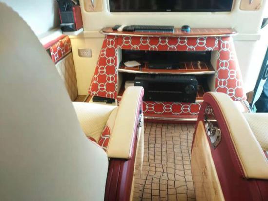 4:内部配置internal configuration驾驶舱座椅6向电动调节|真皮航空座椅(带腿拖、脚拖)|座椅电动调节(按摩通风加热)|三折四方向电动沙发床|迈巴赫式车顶(全色系电控变色)|皇家级进口顶级船钟|高端游艇级柚木地板|全车内饰实木装饰|豪华水晶酒柜装饰|可拆卸小桌板|全球顶级邦-奥陆芬环绕音响|3D4K高清可升降液晶电视|电器集成触摸控制系统|电动升降隔屏|驾驶舱DVD一体机|车载iPad控制系统|philip空气净化器|车载冰箱|philip空气净化器|前后舱电话|220V电源插座|前后独立空调系统。Cockpit Seat 6-Direction Electric Adjustment | Leather Aviation Seat (Legged Drag, Foot Drag) | Seat Electric Adjustment (Massage Ventilation Heating) | Three-fold Four-Direction Electric Sofa Bed | Maybach Roof (Full-color Electronically Controlled Discoloration) | Royal Class Imported Top Class Clock | High-end Yacht Class Teak Floor | Luxury Crystal Cabinet Decoration Decoration | Removable Tableboard | Global Top Bond-Olofen Surround Sound | 3D4K High Definition Liftable LCD TV | Electrical Integrated Touch Control System | Electric Lift Separator | Cockpit DVD Integrated Machine | Vehicle-mounted iPad Control System | Phip Air Purifier | Vehicle Refrigerator | Phip Air Purifier | Front and Back Cabin Telephone | 220V Power Supply Socket | Front and Back Independent Air Conditioning System Unification。