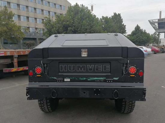 从外形上我们可以看到,Humvee C和悍马H1大致上非常相似,而如果你找到一张HMMWV的图,你会发现,相比悍马H1,Humvee C相对于HMMWV的相似度更高。其实Humvee C在HMMWV的基础上改动最大的地方在于内饰,外形上除了不符合国家标准的地方全都保留了原版军车的原汁原味。由于是中置引擎,发动机舱相对来说比较宽敞,透过中网我们看到的是巨大的散热片。引擎盖上硕大的挂钩是用来空降用的,自带的涉水喉让Humvee C拥有762mm的涉水深度,因为采用的是军用可拆卸式车门,所以看起来颇为简单硬朗,Humvee C配备了副油箱,总共拥有120升的超大容量,
