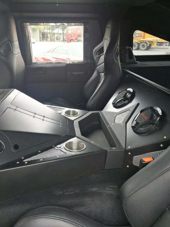 Humvee C的钢板用了800多颗铆钉铆接在一起,结实程度简直堪比装甲车,车内的整体结构还是军车的样子,不过在材质和细节方面做出了一些改动,Humvee C更换了订制的赛车座椅,舒适性和包裹性都不错,原先给机枪手站立的位置,如今被改成了储物架,不过这个储物架貌似有点太大了。后斗全部用实木进行包裹,视觉感受相当不错,把后斗打开,铺个床垫就能睡午觉了,这空间绝对没得说,方向盘更换为了momo的赛车方向盘,中控台还是充满了浓浓的军车气息,坐在里面感觉像是在开坦克,基本功能都在这个区域,不过操作还是得习惯一阵子,不过令人颇感意外的是,Humvee C竟然装配了360度倒车影像,越野车必备的两个档把,点烟器和USB口齐备,这点倒是挺人性化的