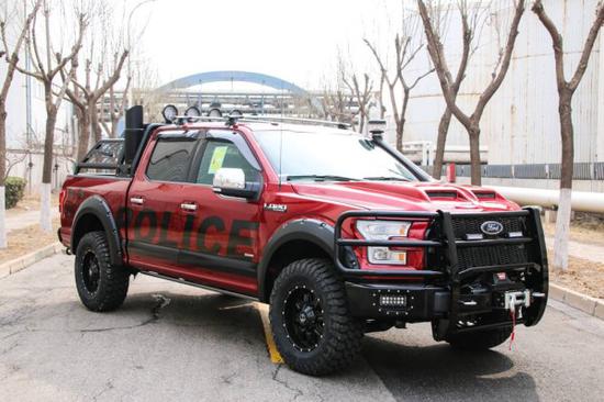 福特F150改装战警版实力不凡,潇洒不羁,在悬挂行程较短的情况下,避震软以保证舒适性,但当悬挂行程接近极限时,整个减振器就会变得异常坚硬,以抵挡落地冲击,福特F150增加了一个全新液晶屏MyFord驾驶员链接技术,中控台触摸屏和安装在方向盘上的五向控制键,液晶屏驾驶员的程序配置包括:行车电脑、燃油经济性和拖车系统、越野应用菜单等。