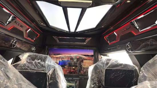 GMC G770S内饰采用纳帕红顶级真皮包覆,以电动升降电视机为隔屏将前后舱分为两部分;后舱搭载多功能瀑布型中控台,内置隐置式电动酒柜、隐置式电热水壶与隐置式车载视频会议系统、车载密码箱 HARMAN高级影院音响系统、10”多功能触摸屏控制系统、储物槽等配置,行车途中享受快乐出行。