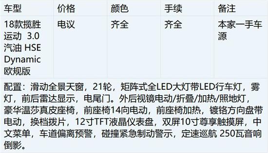 18款全新路虎揽胜运动3.0汽油版基本参数:长*宽*高4851*2073*1781MM发动机:3.0T 385马力(HSE Dynamic)V6 轴距:2924MM 油箱容积:105L 最大行李箱容积:1761L,档位个数:8档手自一体,最大功率:283KW 最大扭矩:450N.M 最大功率转数:6500,驱动方式:前置四驱 车体结构:承载式,百公里油耗:10.2个,百公里加速度:7.1秒,最高车速:210(km/h)。