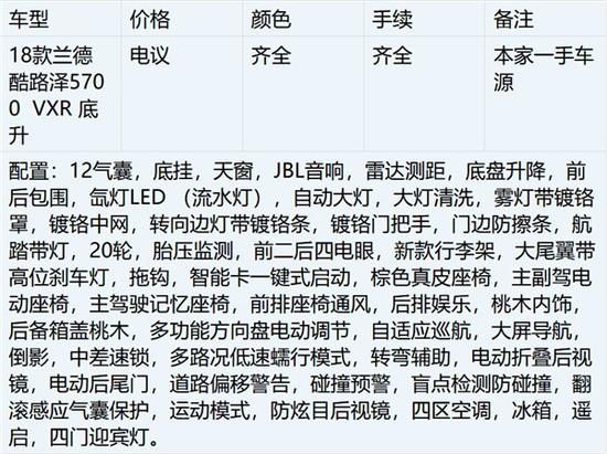 18款丰田酷路泽5700VXS限量版参数动力:进口类型:丰田(平行进口) 长*宽*高:5170*1980*1930MM 车身结构:5门7座SUV油箱容积:138 发动机型号:3UR-FE 排量:5663 进气形式:自然吸气 气缸排列形式:V8 每缸气门数:4 最大马力:397 最大功率:270 最大功率转速:5600 最大扭矩:529 最大扭矩转速:3200 变速箱:8挡手自一体变速箱驱动方式:前置四驱 四驱形式:全时四驱 车体结构:非承载式 轮胎规格:285/60 R18 备胎规格:全尺寸。