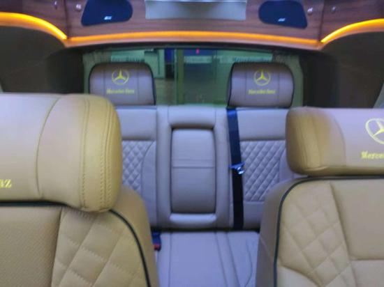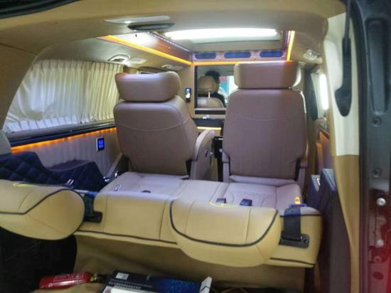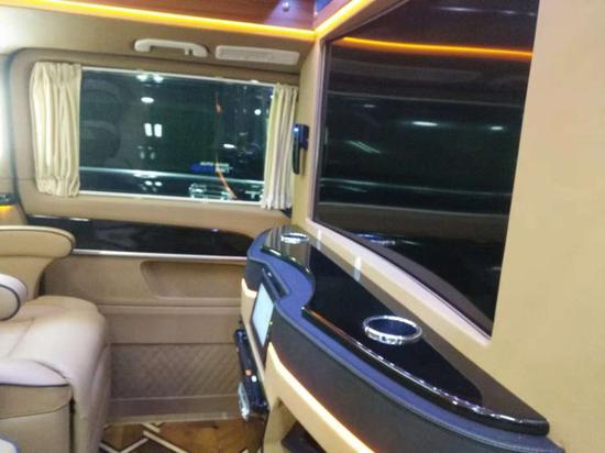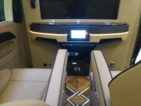 隔断的内饰+布艺窗帘让整车具有极高的私密性,整车红色加白色的内饰及优雅又热情,隔断部分是一个大尺寸的电动升降液晶电视+中央控制系统+影音级的音响系统。第三排座椅电动放平可做沙发床,在较长的路程时可以更好的休息。顶部是电动的全景天窗+嫩黄色的氛围灯。从后往前看整车的空间很大,第二排座椅180度旋转时还可以形成一个四人会议格局。The partition interior + cloth curtain makes the whole car very private。 The red and white interior and elegant and warm。 The partition part is a large-scale electric lift LCD TV + central control system + audio and video audio audio system。 The third row seats can be used as a sofa bed to make a better rest。 The top is an electric panoramic sunroof + bright yellow atmosphere lamp。 Looking back and forth, the whole car has a large space。 When the second row of seats rotates 180 degrees, it can also form a four-person meeting pattern。
