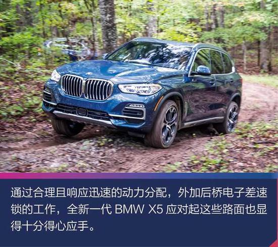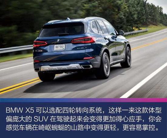 除此之外,BMW X5还提供四轮转向系统供消费者选配,这样一来这款体型偏庞大的SUV在驾驶起来会变得更加得心应手,你会明显感觉车辆在崎岖蜿蜒的山路中变得更轻,更容易掌控,车辆自身的极限也变得更高,这是为X5出色的公路性能做出锦上添花的选项。