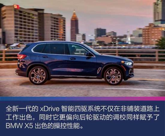全新一代的xDrive智能四驱系统不仅在非铺装道路上工作出色,同时它更偏向后轮驱动的调校同样赋予了BMW X5出色的操控性能,为了提高效率,在无需四驱工况的时候动力可完全分配至后轮。