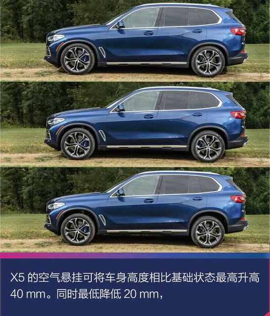 此外,空气悬挂还会配合道路信息监测功能使用,当分布在车辆周围的传感器监测到可能会有无法通过的障碍时会自动升高相应的高度,如遇到涉水路面空气悬挂也会自动抬升,使得驾驶BMW X5到野外变得更为轻松。