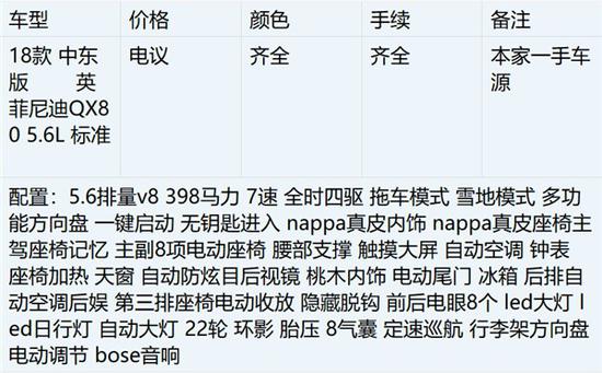 18款英菲尼迪QX80是一款全尺寸SUV,动力方面,英菲尼迪QX80搭载的是一台型号为VK56的5.6L V8发动机,最大功率为324/5800(Kw/rpm),最大555牛米的扭矩在发动机转速达到4000转时爆发出来。传动方面,英菲尼迪QX80采用带有自适应学习程序的手自一体7速变速器。前悬挂采用独立双叉式悬架+横向稳定杆;后悬挂采用独立双叉臂悬架,车身非承载式车身,车辆底盘如车身外观一样敦实强壮。其中手动模式提供了顺序性升/降档操作和降档升速匹配功能。18款英菲尼迪QX80前两排座椅为乘客提供了顶级的舒适性,抛开轴距长度来说,它的第二排乘客腿部空间是同级别中最为优秀的。与第二排相比,第三排的座椅空间并没有那么出色,但是仍比凯雷德要更为宽敞,乘坐舒适性也要更胜一筹。行李舱空间为470升。