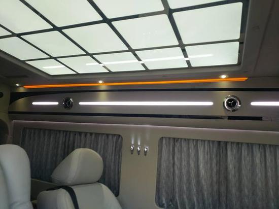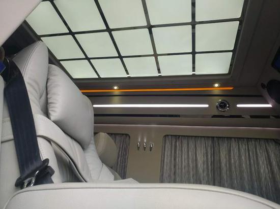 奔驰威霆福祉车长宽高5370*1901*2160mm,纵向空间大,前后舱未隔断,全车7座设计:2驾驶座+1福祉座+1独立座椅+3人连排沙发(可电动变床),一家人出行,均享有独立的腿部和头部大空间。