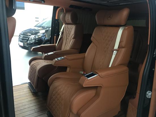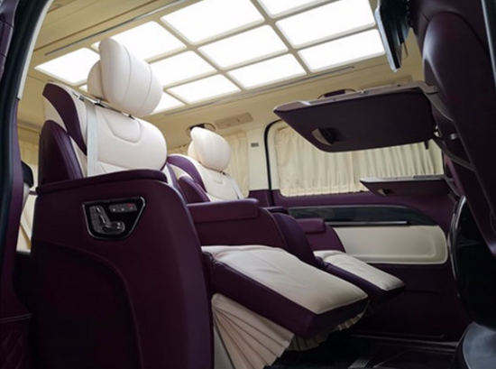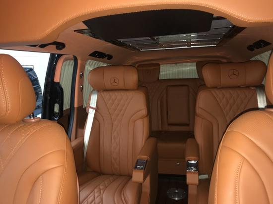 定制配置:WALD大包围 迈巴赫九宫格车顶 车顶麂皮绒包覆全车米色紫色双拼真皮内饰 车载专用冰箱 全车铝制地板 碳纤维内饰