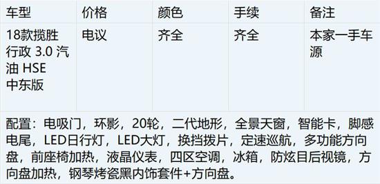 18款路虎揽胜行政版3.0T V6发动机,8速手自一体变速箱,车身尺寸4999*1983*1867mm,最高车速280,百公里加速6.5s,综合油耗10L,轴距2922mm, 油箱容积105L,最大功率250,最大功率转速6500,最大扭矩450,最大扭矩转速3500-5000,新车采用非常炫目的隐藏式换挡杆,在发动机 启动后,换挡旋钮可自动升起。