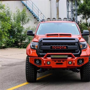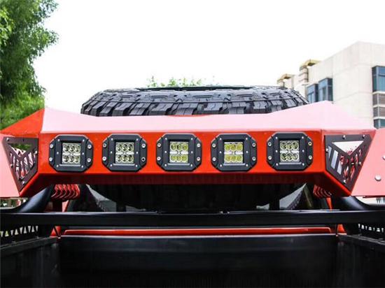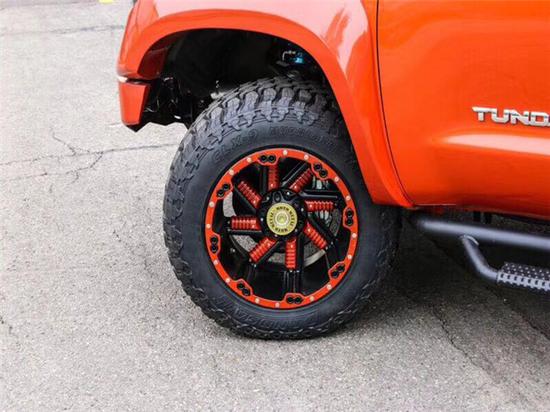 外观方面,这辆坦途通体为橘色,颜色十分扎眼,通过格栅,保险杠,引擎盖和底盘3英寸的举升高度实现了非常不错的改装效果。车头部分,升级了TRD PRO中网、带散热口的引擎盖和攀爬杠,整体视觉效果还是非常霸气的。针对前保险杠的改装囊括了一个梯形的攀爬杠,这部分会对该车攀爬时起到关键的作用。
