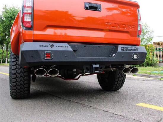来到车身侧面,最值得说的当然是宽体套件和龙门架了,整体搭配的非常和谐,凸显出坦途的野性。同时我们可以看到这辆改装坦途采用了钢制的脚踏板,不同于电动伸缩脚踏板,钢制脚踏板会在可靠性上拥有绝对性的优势,在恶劣条件下尤为重要。龙门架虽说视觉效果满分,但这样无疑会侵蚀皮卡的后方货斗空间,这对国内的改装坦途车主来说完全不是问题,他们也不会真正拿这辆车去拉货的。所以视觉效果是优先级。车尾方面,改装了双边四出的排气管,但却没有绞盘预留口,可以说这辆改装坦途并不是真的要去野外越野,更多的还是在城市行驶。