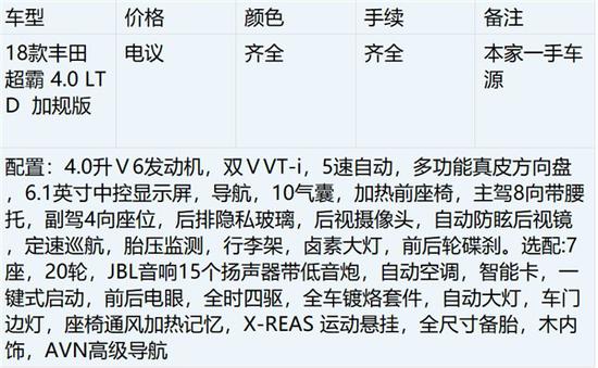 18款丰田超霸分高中低三种配置。高配的配备底盘升降。全新丰田超霸车型是鲜为人知的一块硬派SUV,同为丰田旗下,只是目前在国内的宣传不够,但是并不能埋没他的真正实力,超霸比霸道宽,比霸道稳,比霸道做工精致,舒适性与操控性都强于霸道。