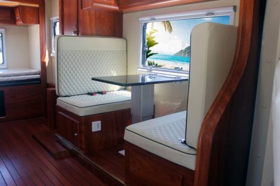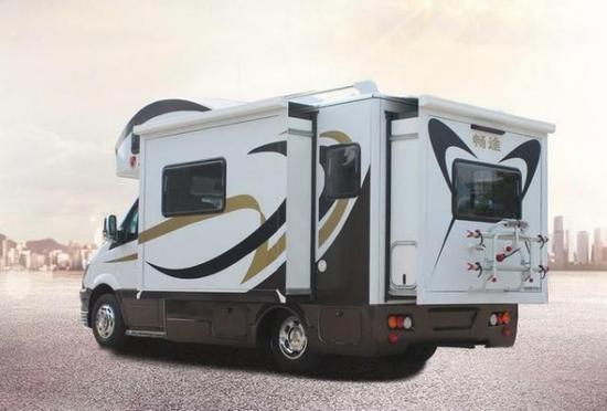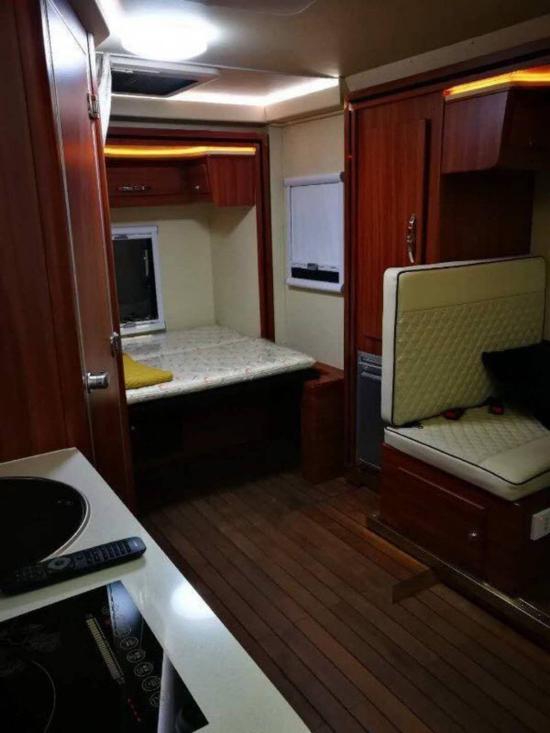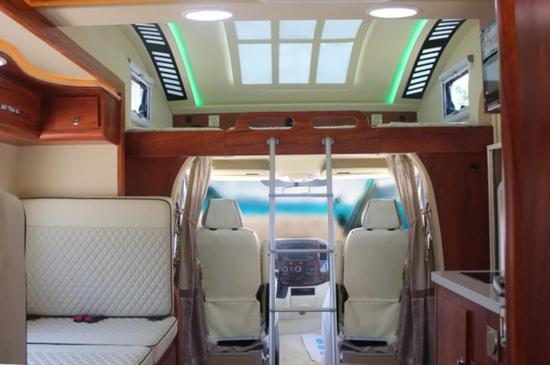 通透的车厢采用了经典的前中后的布局,符合国人的生活习惯,前部为卡座沙发可变儿童床、储物柜,上方为电动升降床,中部为厨房+卫生间,尾部为环形沙发和多功能桌,也可变换成双人床。