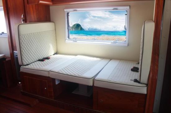 左侧对座沙发座椅,中置电动升降小桌板,一键操控降下即可拼成沙发床,填充物柔软厚实,旅途也能安心舒适。随心变幻的空间组合,多样的对座沙发座椅可变床,驾驶舱顶部双人大床,车后部单人床可变双人床,电动控制灵活方便,自由选择随心所欲。