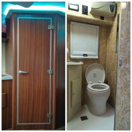 独立的卫生间,车间超大的马桶,大面积化妆镜、照明灯完备的洗浴设备。室间仿大理石面墙防水防潮。配置了电磁炉和隐藏式水槽,洗涮和简单料理。
