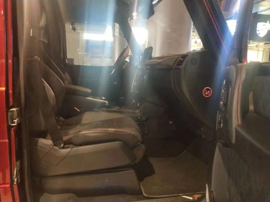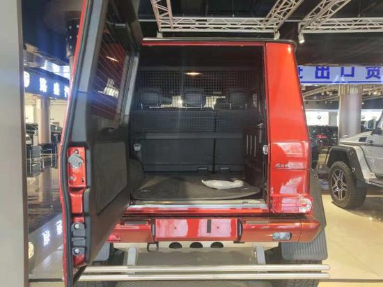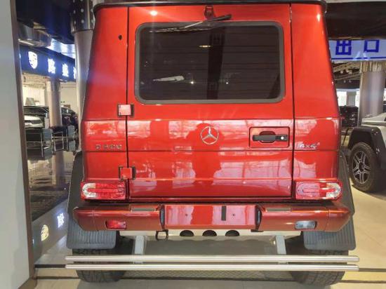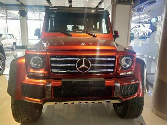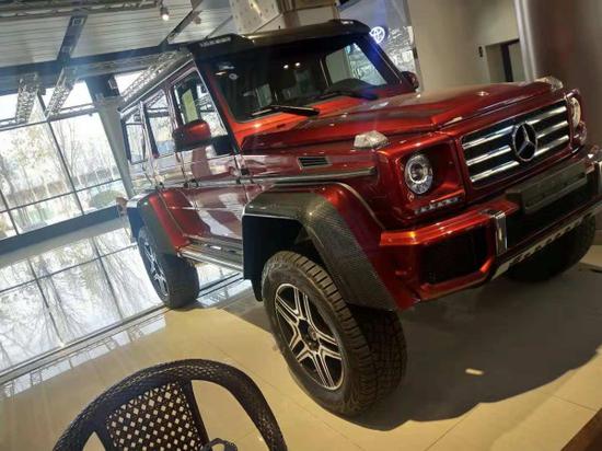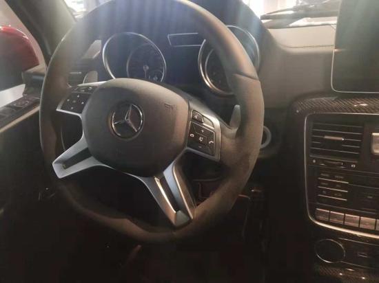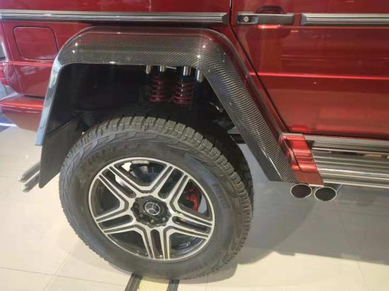 奔驰G5004X4配置:离地距离 450mm、涉水能力 1米、轮胎间距 1.744mm、3种驱动模式、22寸轮毂、碳纤维外观、每个轮胎带有两个减震器及两个悬架弹簧单天窗、22轮、红卡钳、双减震、氙灯LED日行灯、多轮廓电动包裹座椅、翻毛皮内饰(翻毛皮双色座椅、翻毛皮方向盘、翻毛皮门板、翻毛皮内顶)、前排座椅通风加热、二排座椅加热、哈曼音响(14个扬声器)、三把差速锁、中控碳纤维装饰、底盘舒适度调节、脚踏、前电眼、倒影、导航、多功能方向盘(蓝牙、换挡拨片)