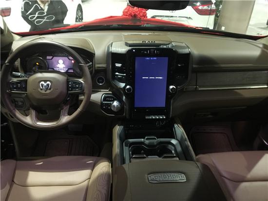 19 款道奇公羊大角牛皮卡在内部设计上还是延续了美式那种比较粗犷的风格,规整的中控台设计看上去比较死板,但丰富的配置会让你不由得为其称赞。中控台的设计简洁硬派,符合公羊的气质。仪表盘底边有花纹,则更加凸显了这款车的文雅性。软性材质的仪表台设计,摸上去手感非常舒服,并无些许生硬之处。