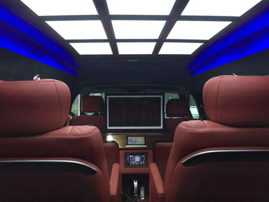 福特F150的内饰采用独特的中控台和门饰板面漆和真皮包裹的方向盘,方向盘可以上下前后调节。轴距3690mm,拥有宽敞的内部空间,全车黑红搭配的电动调节真皮座椅,用豪华舒适来形容一点也不为过。特殊定制具备了越野车更高的防震能力。第二排拥有通风加热功能,而第三排三人座椅可前后移动放倒平躺,更有一键式的灯光控制。福特F150皮卡做到越野性能,同时拥有了商务SUV的豪华与舒适,抛开外表,简直可以跟MPV媲美。