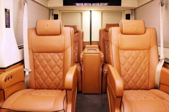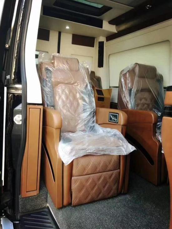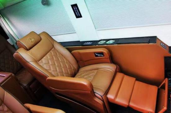 奔驰斯宾特房车全舱真皮包裹,成南京云锦公司特供云锦丝绸布料,防鳄鱼皮地板铺设,配置齐全,奢华高档、空间充足。车型长宽高为5910×1993×2800mm,成年人可在车内直立行走。全车座椅呈2+2+3排列,全部真皮制作,二排座椅(配有通风加热按摩系统+旋转调节+电动腿托。三连坐)排座椅除靠背调节、前后移动,平放当床竟然还带按摩功能,尽显高大上有木有,多体贴,多可人,最后排客人完全无压力。 最值得一提最豪华还得是后排座椅,第三排配有进口航空座椅,厉害之处是这个座椅除了按摩通风加热,电动前后调节,电动腿托。