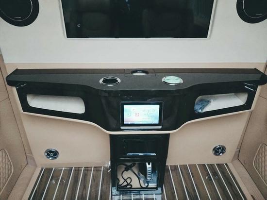 因为这款奔驰V260l商务车是为了商务人士量身定制的款式,所以在后舱空间布局上采用了全隔断的设计,这样就可以很好的保证后部贵宾舱的私密性。同时增强了娱乐功能性,配置丰富,包含可升降32英寸超大液晶电视,以及进口丹拿音响和建伍功放系统,可以让后舱乘员享受极致的影音盛宴。电视下方T型吧台设计有杯托和纸抽盒实用方便并且具有一定的储物空间,同时不占用前排乘员的腿部空间而且美观实用,吧台中部的控制屏,可以对车内的灯光、电视、电源、天窗等一键进行控制,实用方便。全车隔音隔热处理,做到了外在体面,内在舒适。地板铺装游艇级实木地板,高贵实用,不仅保留了实木地板的自然木纹和舒适的脚感,同时又解决了古老的实木地板难保养的缺点。