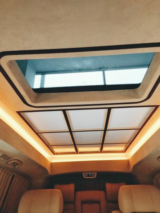 车顶部的小天窗面积为0.5㎡可有效增强车内采光以及进行通风换气,有效的减少车内乘客的压抑感。后舱采用九宫格式顶灯,这种设计源于奔驰S级迈巴赫,由此可见奔驰V260L的家族地位,一下就将车内奢华氛围提升不少。九宫格顶灯,氛围灯、迎宾灯、阅读灯等各种灯光一样不少,满足家庭出行或者公司商用。