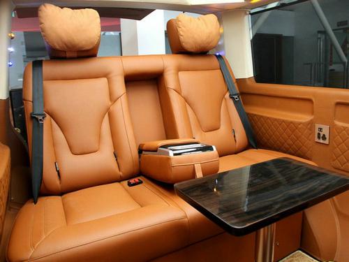 后排座椅为三人沙发座椅,椅面宽大空间充足,乘坐三个成年人也不会产生拥挤感。当只有两人乘坐时,可以将隐藏在靠背中间的位置扶手放下让乘坐更加的舒适。需要时也能调节座椅形成一张宽大的休息床,功能性十足。还配备了一个后舱小桌方便进行车内人员的办公或者娱乐活动。