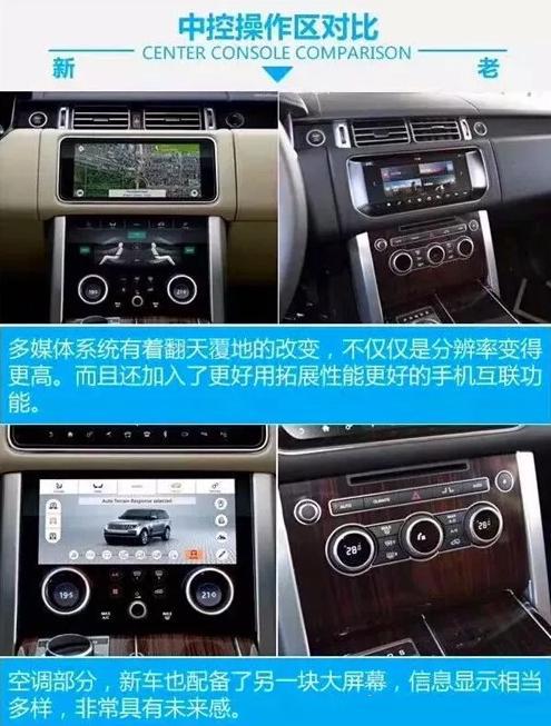 1、车身新增拜伦湾蓝、罗赛洛红,取消中国红、蒙塔奇诺红、凯库拉棕的选装。2、外观采用了新的蜂窝式中网设计,新的阿特拉斯侧鳃,新造型尾灯和尾喉。3、轮毂增加了新样式及尺寸,满足各种地形需要。4、采用LED作为发光光源,高配可选择激光光源,照射距离可达500米。采用智能可变式控制,迎面会车自动关闭部分LED光源防止炫目,满足夜间行车需要。5、全系取消卷云白内饰选装,尊崇创世版新增浅褐色内饰,取消黄褐色、樱桃红色。6、延用了星脉的Touch Pro Duo双屏触控风格,科技感更强,保持家族化设计语言。7、入门级保留不打孔的高级纹理真皮选装,HSE或VOGUE不再选用高级牛津打孔真皮,改为打孔温莎真皮,采用新的座椅样式。8、摒弃座椅两侧底部的座椅调节设计,采用类似于奔驰S级的触控,位于门板两侧。9、内饰风格新增直纹核桃木,喀拉哈里,尊崇又增加了暗灰色栓木、银灰色直纹木。10、采用新的地形控制面板操作布局。11、新增智能手环,离子空气净化器,感应式天窗遮阳帘,智能遥控座椅(须车型及APP支持),后排车顶阅读灯亮度触摸调节功能。12、后排提供8个连接,包括3个12V输出,2个USB,2个HDMI,1个dometics plug scoket(国内插座)。13、尊崇创世版采用新的商务舱式后排座椅,最高配增加热石按摩功能,并有25种按摩程序预设,加热中心和加热腿拖(在驾驶员和乘客后),脚部加热(仅在副驾驶后)