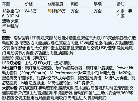 2018款宝马X6参数动力:进口类型 厂商:宝马(平行进口) 长*宽*高:4909*1989*1702MM 车身结构:5门5座SUV 最高车速:209 百公里加速:6.4 轴距:2933 最小离地间隙:185 整备质量:2155 油箱容积:85L排量:2979 进气形式:双涡轮增压 气缸排列形式:L6 最大马力:304 最大功率:224 最大功率转速:6400 最大扭矩:407 最大扭矩转速:5000 变速箱:8挡手自一体自动变速箱 驱动方式:前置四驱 四驱形式:全时四驱 中央差速器结构:多片离合器 前悬架类型:双叉臂式**悬架 后悬架类型:多连杆**悬架 车体结构:承载式 驻车制动类型:电子驻车 市区油耗:13 高速油耗:9.7。