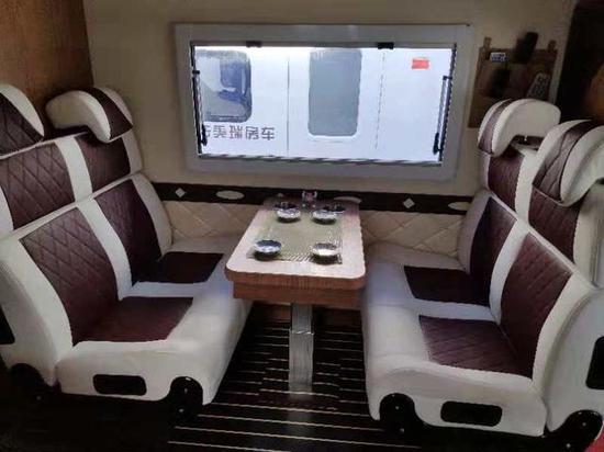 在驾驶室后方是一套白棕红双拼的双人卡座对坐沙发,沙发配有三点式安全带,可以坐4人,加上正副驾驶座,车内最少可坐6人,但是房车的荷载人数是6人,千万不要超载哦。将桌子降下能与沙发拼成床铺,车壁采用米白色菱形格软装包覆,美观大方。
