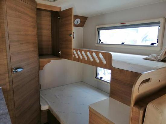 房车尾部是一张上下铺格局的床,加上额头床和沙发床,这辆房车总共拥有四床布局,也就是说至少能满足5-6人睡眠,跟亲朋好友一起出行时最适合不过的。