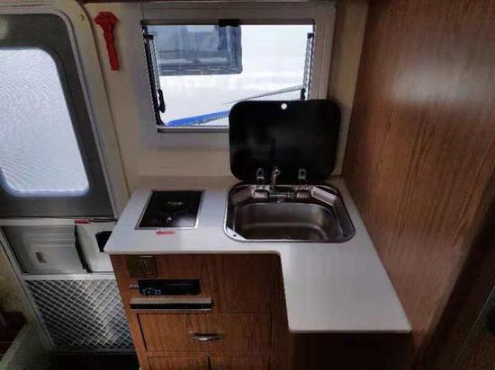打开车门,车门处一眼就能看到的是厨房区,上方配备了车载微波炉、车载抽油烟机和燃气报警器,操作台面上为进口燃气双灶和洗菜池,内部空间虽然不大,但是为了增加使用空间,特地将操作台面设置成了L形状,也能摆放不少东西了,内部配有电磁炉、水槽、橱柜等基本配置,方便您出行的饮食生活。