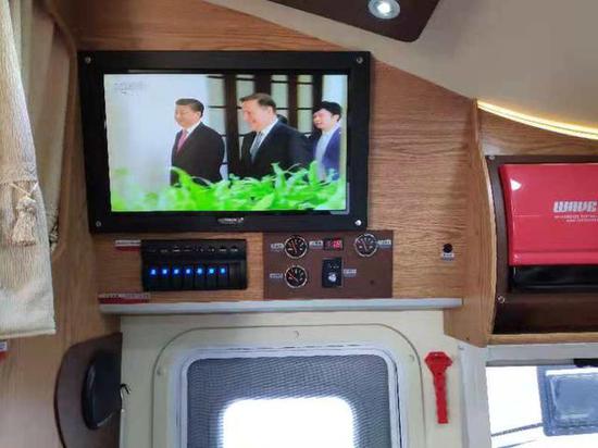 车门上方配有一个液晶电视,和氛围灯控制面板以及清水箱、污水显示、电压表、逆变开关等。