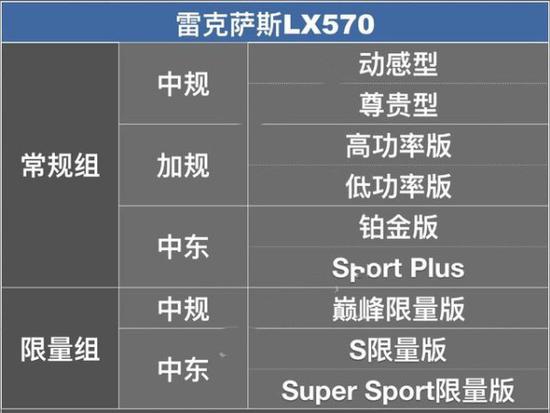 而4S店里的中规版,有两个常规版型号,一个限量版型号,一共3个型号。再加上平行进口版的6个,市面上在售的LX570,一共有9个型号,可以分为常规版和限量版两组: