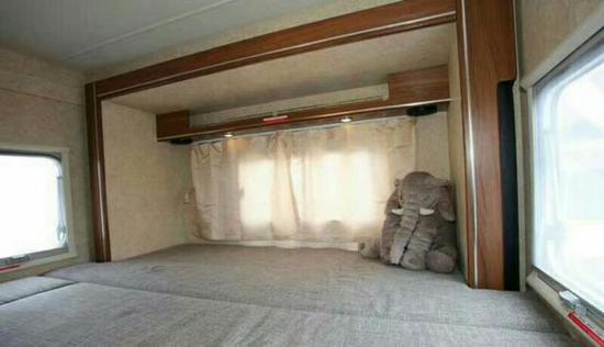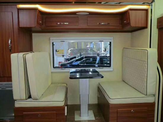 通透的车厢采用了经典的前中后的布局,符合国人的生活习惯,前部为卡座沙发可变儿童床、储物柜,上方为电动升降床,中部为厨房+卫生间,尾部为环形沙发和多功能桌,也可变换成双人床。