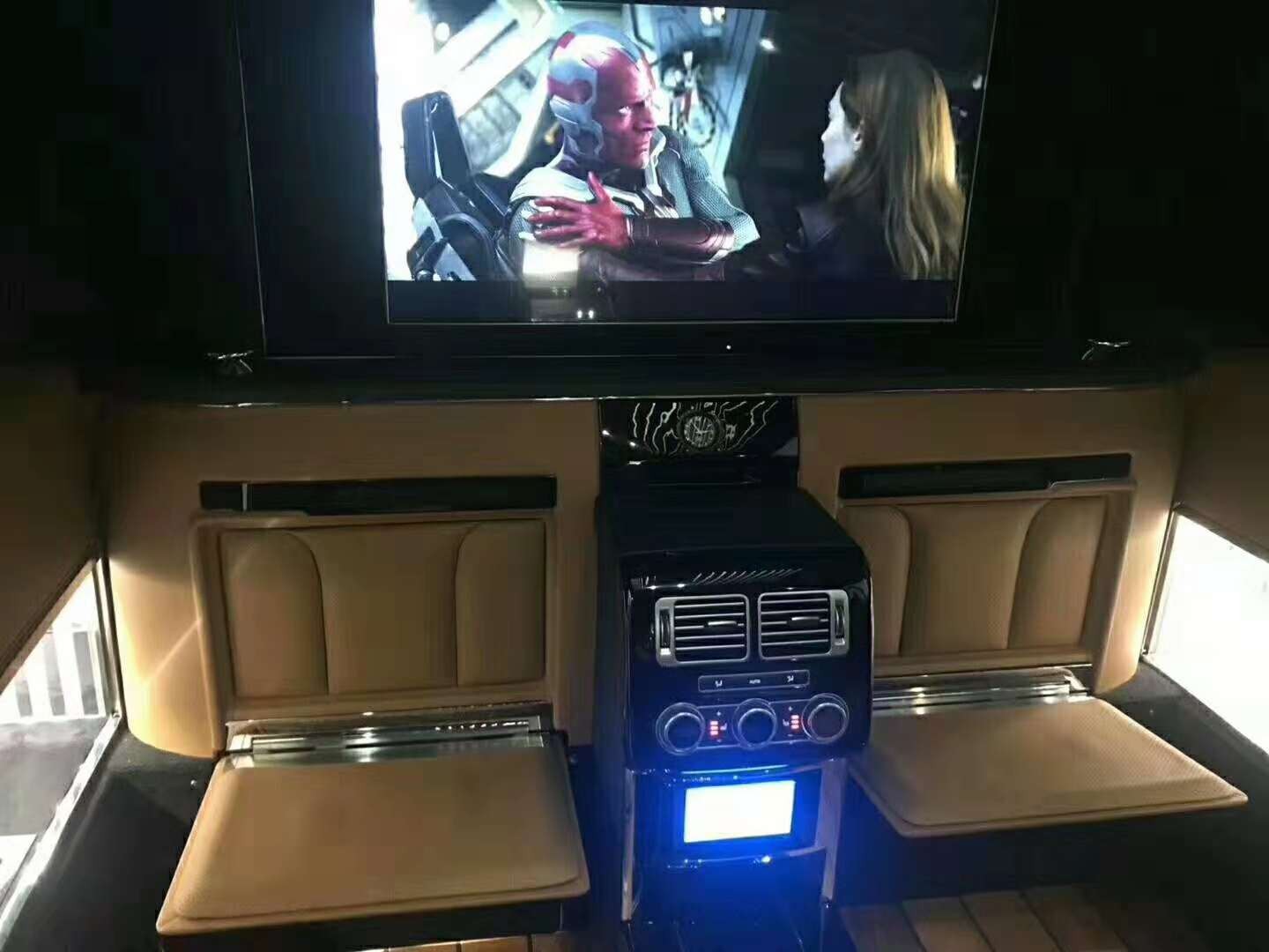 2018款路虎皇家一号加长版来到后舱,由氛围灯营造出超豪华的感觉,布局为两座,座椅全部使用航空座椅。除了拥有17度后排椅背调整幅度,还有座椅加热、通风以及按摩功能、推脱功能也是必不可少。老板们想要的,可以说他都有了!科技感十足,后舱控制器为一台平板电脑控制,以及各种功能按键及储物盒,配有几块led液晶娱乐屏幕,完全是土豪级的享受啊。前后舱之间有一台可升降卫星电视,在旅途劳累之余也可看看电视,听听音乐放松一下!