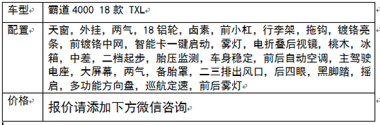 [2018款丰田霸道4000降价天津港真实报价配置哪款合适报价优惠多少钱手续齐全当天开票 丰田霸道4000外观内饰油耗性价比怎么样 天津港口最低报价多少钱 分期购车 永驰兴业原创]2018款丰田霸道4000在内饰以及配置上汇集丰田品牌的奢华元 素以及先进科技。新款丰田霸道中控台有意设计成分体的样式,阶梯布局将多媒体与空调控制区和谐地分割,不仅一目了然而且便于车主熟悉掌握。四幅方向盘和中控面板的银色双竖条相呼应,还在沉稳中体现出一丝科技感。进口霸道4000中东版镂空的镀铬前格栅威武无比,后保险杠比现款更低,新设计的备胎罩则比现款更生动。中东霸道4000长宽高分别为 4760、1855、1850毫米。丰田霸道还配备了可以加热的座席,可以选配无钥匙车门开启系统和丰富的木质内饰组件。