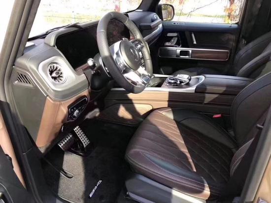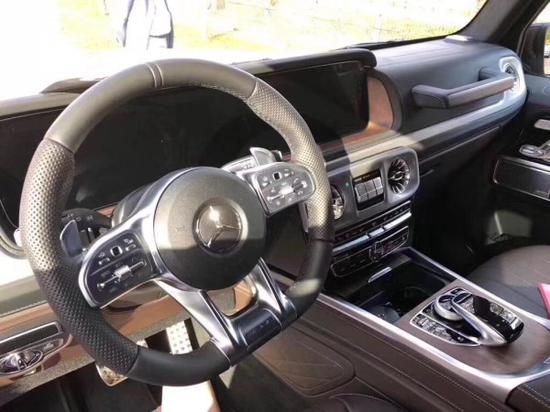 2019款全新G63内饰方面,新G63保留了新G500的整体设计,除配色差异外,新车还换装了全新造型的平底式AMG运动方向盘,其两侧配以打孔皮质包裹,下 部镀铬装饰的造型也与新G 500明显不同,看上去十分战斗。此外,全液晶仪表盘+中控大屏的双12.3英寸屏幕设计在新车上也没有缺席,营造出了浓郁的科技感。