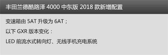 丰田兰德酷路泽4000 2018款新增配置2018款丰田兰德酷路泽4000与2017款相比,增加了一些配置,请看下表: