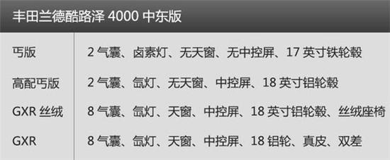 丰田兰德酷路泽4000在中东销售的丰田兰德酷路泽4000分为EXR和GXR两个车型,EXR为基本版,只有卤素大灯、2气囊、17英寸铁轮毂、无天窗、只有中央差速锁和基本的中控多媒体系统。