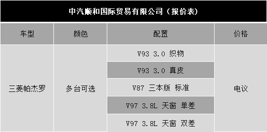 2018款三菱帕杰罗 V97 配置:金标3.8GLS, 真皮座椅,滑动可开启天窗,8气囊,后挂备胎,243匹马力,5速变速箱带运动模式,超选4驱模式,18寸铝合金轮毂,双差速锁,定速巡航,胎压监测,7座真皮,踏板,前雾灯,日间行车灯,大灯清洗,桃木多功能方向盘,高位刹车灯,6.1寸大屏,倒影,主副驾驶电动座椅,腰部支撑,冰箱,自动空调,后排出风口,后电眼,镀铬门把手,镀铬外后视镜电动折叠,车身防蹭条。(了解更多资讯请拨打文章底部24小时服务热线)